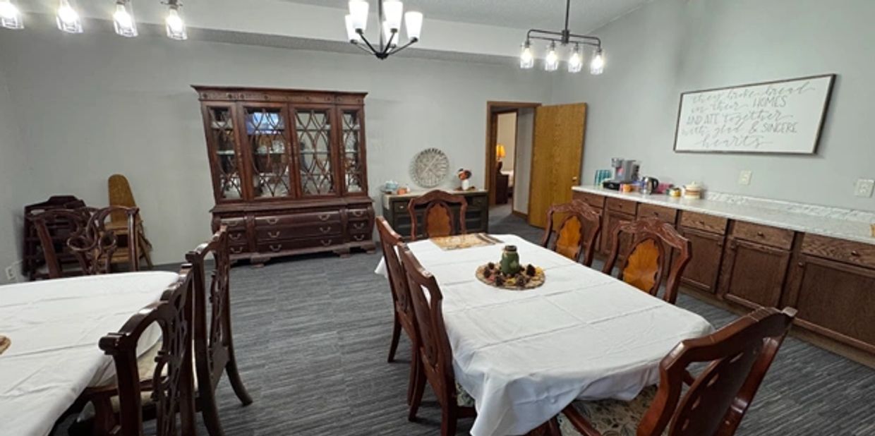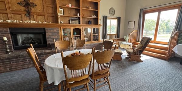 The Great Room includes 5 family-style tables for meals. There are place settings for up to 40 people.